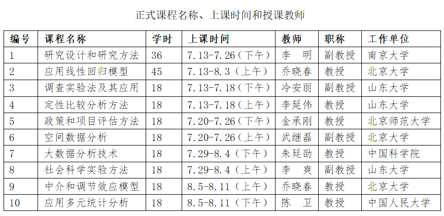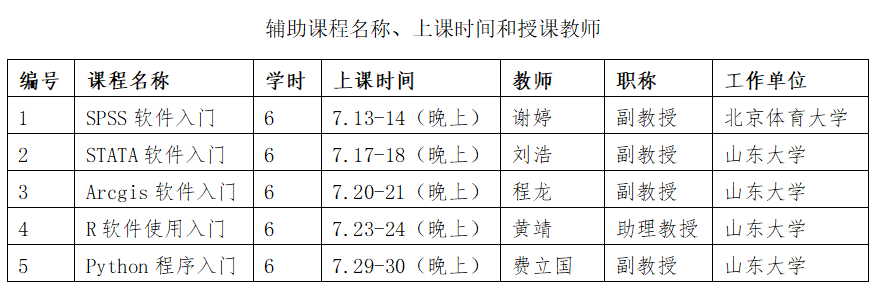今年暑期班将开设10门正式课程,其中36学时课程1门、45学时课程1门、18学时课程8门。此外,还将开设多门辅助课程,主要介绍相关统计软件的使用和与正式课程有关的预备或配套知识。