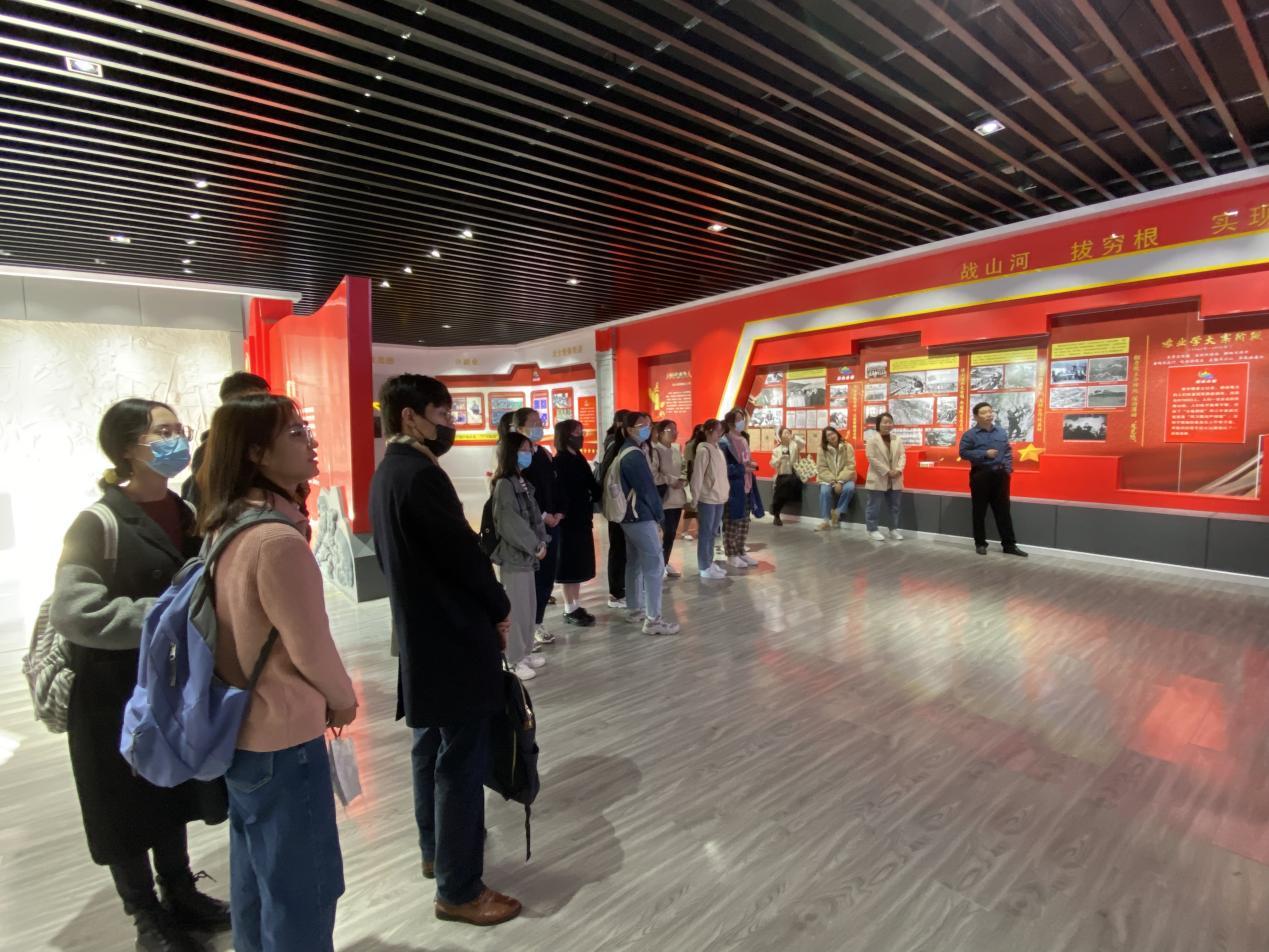调研伊始,李然然带领师生们从水杉大道出发,途中经过“鳌福”机械厂、红旗渠岭、献礼平塘等地点,为师生们讲述了六十年来鳌角石村在历届党支部书记带领下的发展轨迹。接着来到了党史馆,在讲解员的解说下,同学们对该村历届党支部的工作和贡献有了更深入的了解,深刻认识到党的领导在基层工作中的引领性和重要性。