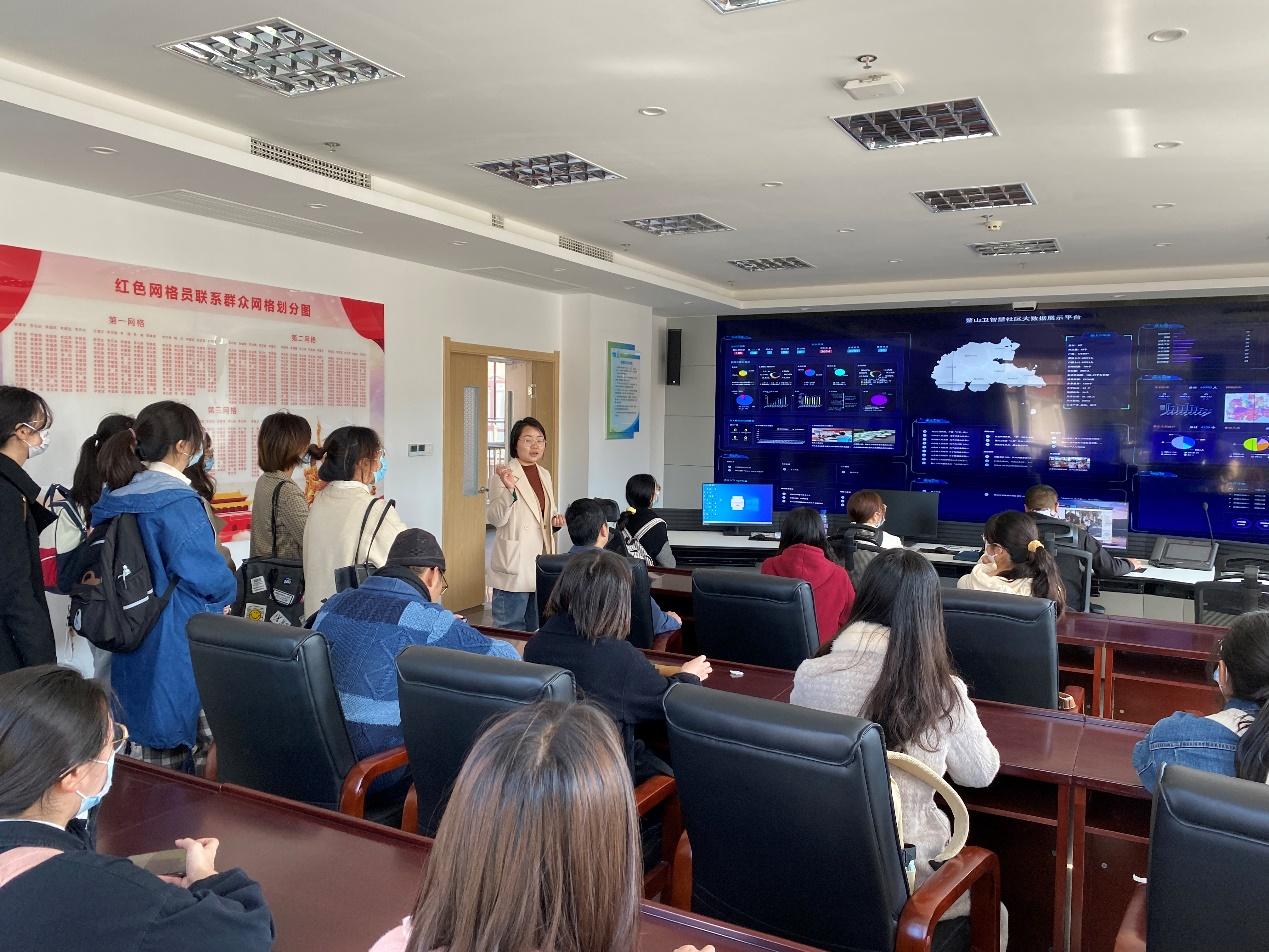 随后,师生一行人又先后前往了特产商店、康养中心及鳌角石村村委会办公楼。在办公楼里,李然然为师生们展示了鳌山卫智慧社区大数据平台的运作以及其在基层治理中的重要作用。