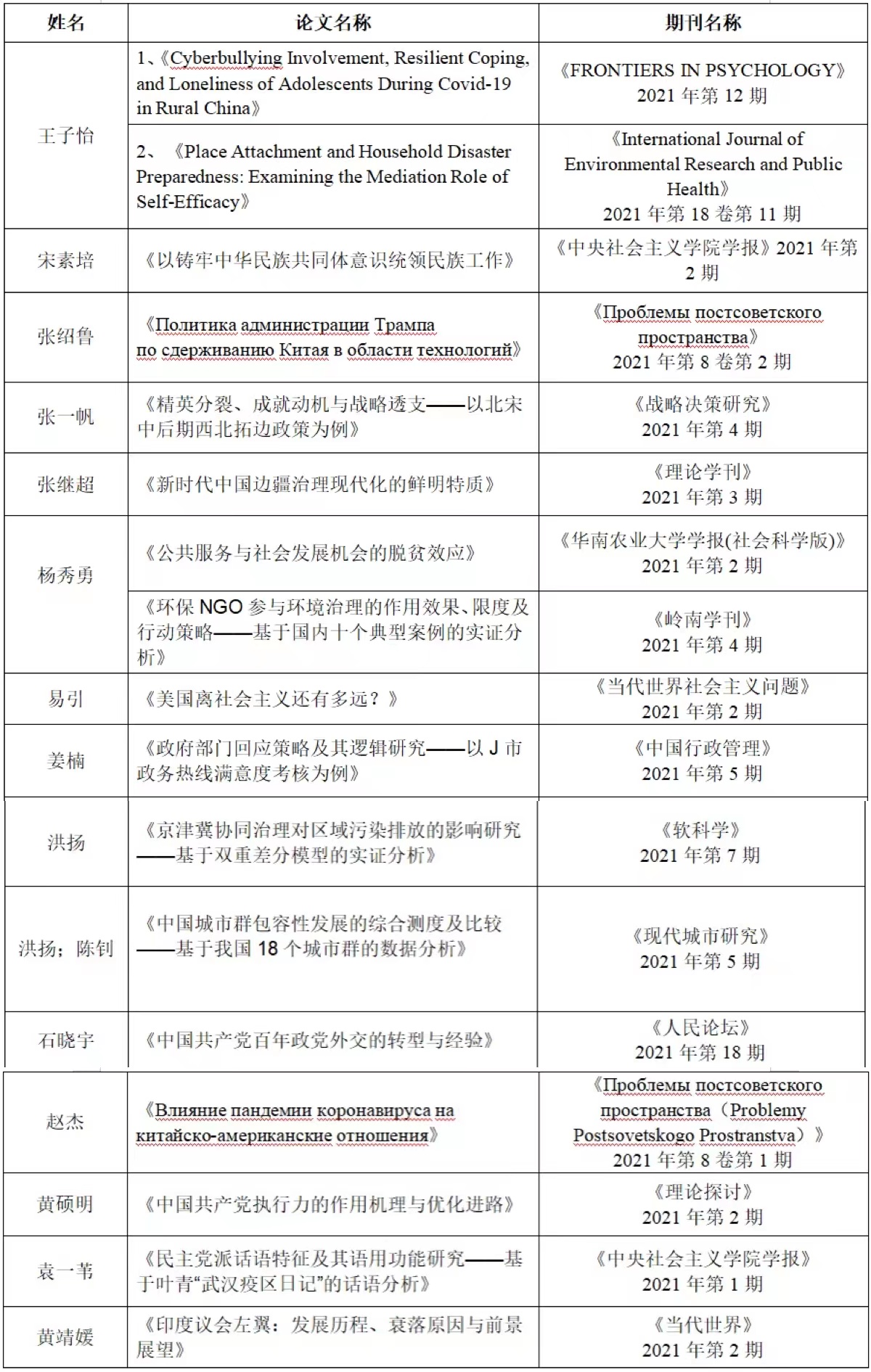 2018级博士研究生杨秀勇累计在《北京社会科学》等CSSCI来源期刊及各类核心期刊上发表专业学术论文十数篇;2018级博士研究生洪扬在《软科学》、《现代城市研究》等核心期刊上发表多篇文章……