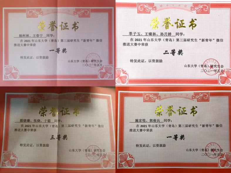 (青岛)第三届研究生“新青年”微信推送大赛中,我院杨柯林和施宏悦两个团队获一等奖,莘子玉团队获二等奖,殷晓璐团队获三等奖;