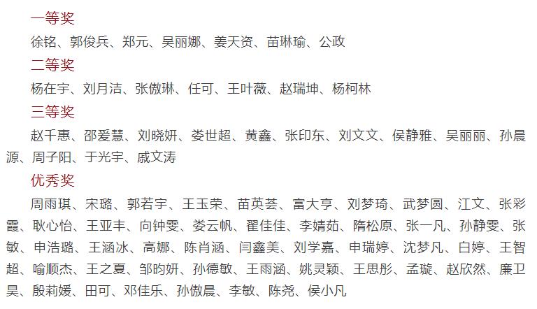 “学四史,守初心,燃青春,担使命”主题征文比赛中,我院王叶薇、杨柯林等同学获二等奖,赵千惠、邵爱慧、侯静雅等同学获三等奖,部分同学获优秀奖;