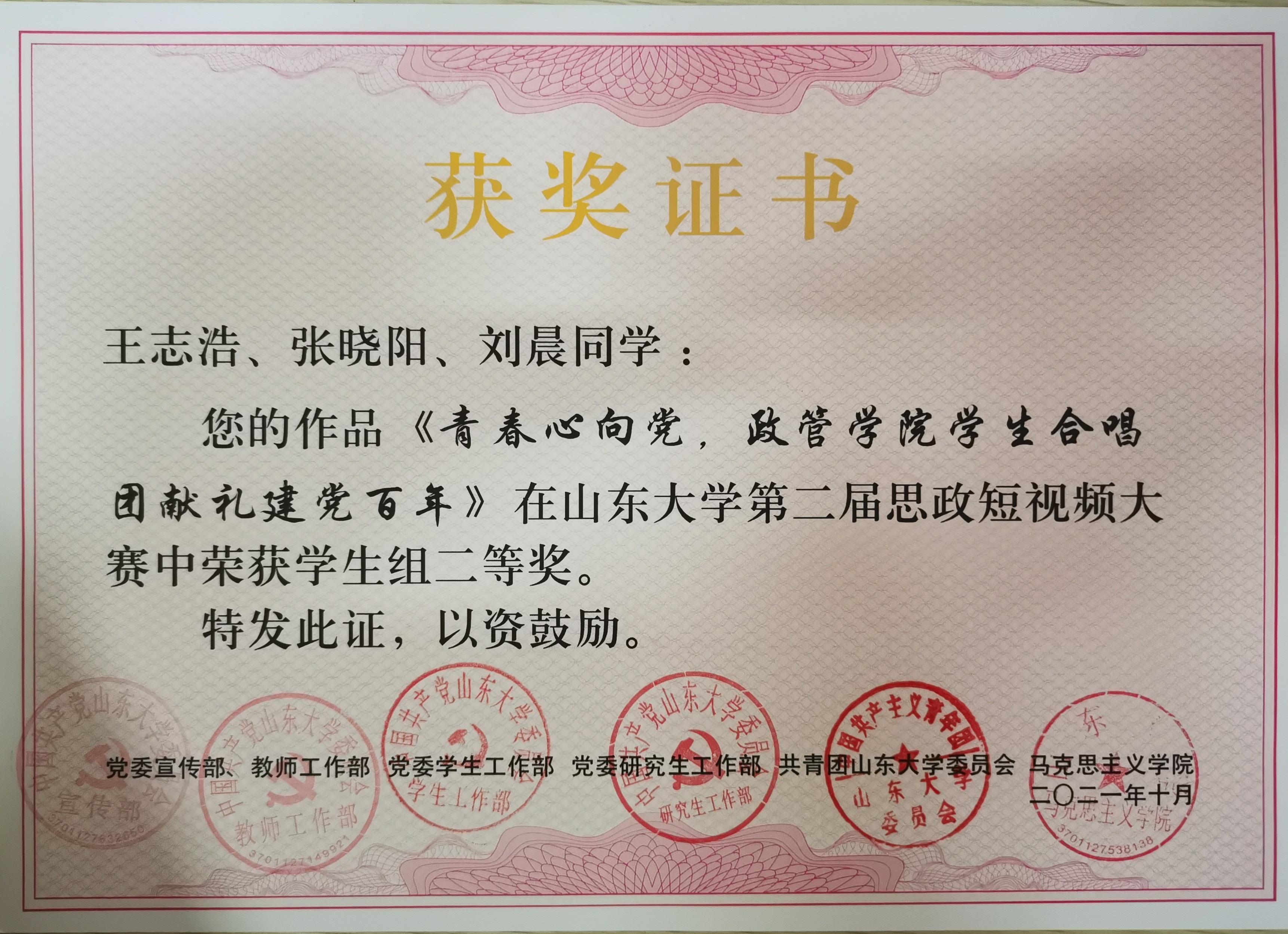 1、在第十七届挑战杯山东省大学生课外学术科技作品竞赛红色专项活动中,郑涵团队作品《找寻青岛红色足迹》获得山东省省级一等奖,全国二等奖;