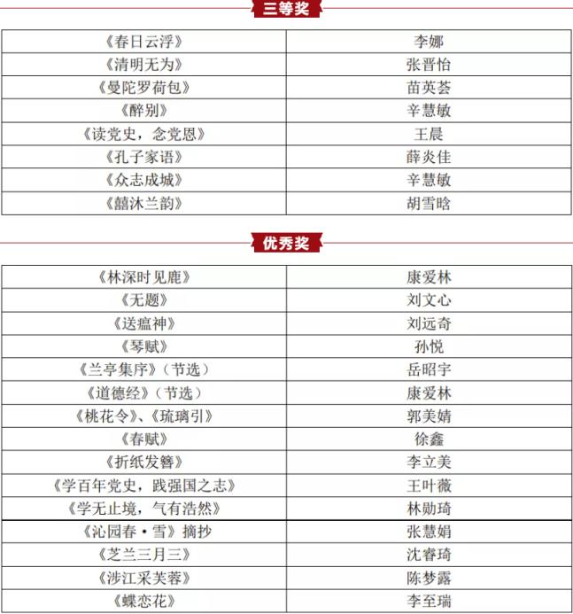 第四届“百年华诞,向党献礼”研究生线上书法大赛中,我院苗英荟同学获二等奖,孟雪迪、刘亚静同学获三等奖;在Rule34
