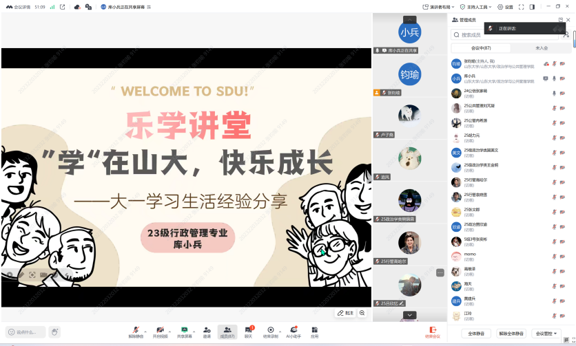 学生会主席团成员、国家奖学金得主、2023级行政管理专业本科生库小兵同学围绕学业发展、选课机制、信息资源工具利用、校园活动与社会实践参与等主题,与新同学们进行了深入交流。旨在帮助新生在未来四年中更好地平衡学习、兴趣与学生工作,实现综合素养的全面提升。