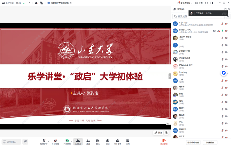 学生会执行主席、2023级行政管理专业本科生张钧瑜以“山大乐相融”为主题,首先为新生讲解了报到注意事项及军训相关事宜,随后详细介绍了在青岛校区衣、食、住、行等方面的生活指南。细致入微的讲解帮助新同学更加从容地迎接大学新生活。