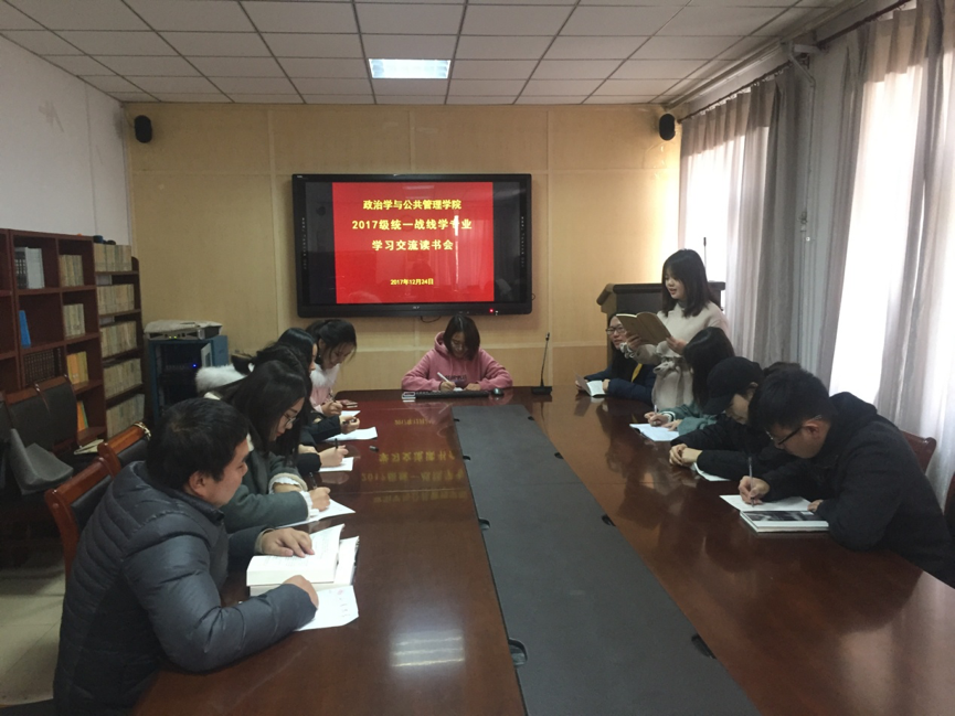 2017级统战硕士班在院楼224举办了学习交流读书会。本次活动分为两个部分:第一部分为全班共同交流《中国共产党统一战线工作条例(试行)》学习心得,第二部分为同学之间相互推荐近期阅读的好书并分享推荐理由。在场同学互动积极,发言踊跃,学习气氛热烈。