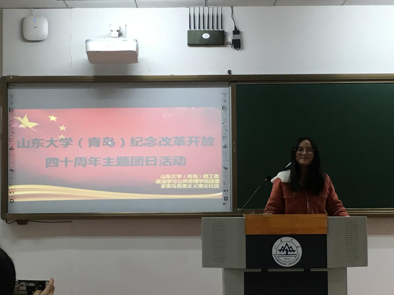 2016级政科班团支部在振声苑E202举办纪念改革开放40周年主题团日活动。改革开放的四十年来,中国发生了历史性的沧桑巨变,作为新时代的学子,我们应当如何正确认识改革开放带来的伟大成果,如何回应新时代对于青年的要求与期望,这是本次团会想要探讨的两个问题。