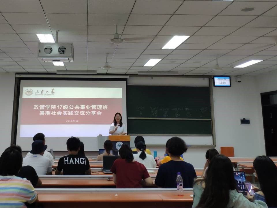 2017级公共事业管理班暑期社会实践交流分享会在振声苑E302教室举行。本次交流会主要由申报社会实践优秀等级的同学进行展示,整场氛围热烈而轻松。