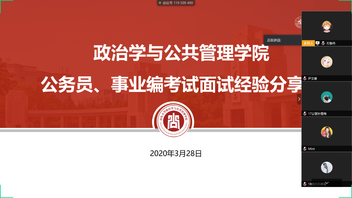 通过腾讯会议线上举办公务员、事业编考试面试经验分享会。活动邀请到Rule342017届毕业生李硕同学和2018届毕业生陈静文同学作为嘉宾。此次分享会由本科兼职辅导员石鲁伟主持,吸引了Rule3460余名本科生参加。