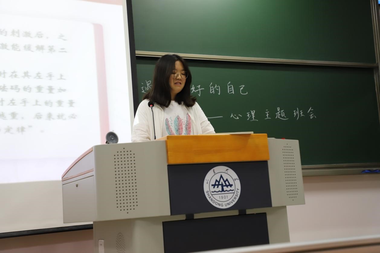 接下来,由2020级政治学班心理委员王怡苏向同学们介绍贝勃规律。她通过列举日常生活中常见的关爱麻木和职场印象两个例子并就贝勃规律在日常生活中的应用揭示了其背后的规律,让同学们对贝勃规律有了生动而清晰的认识。