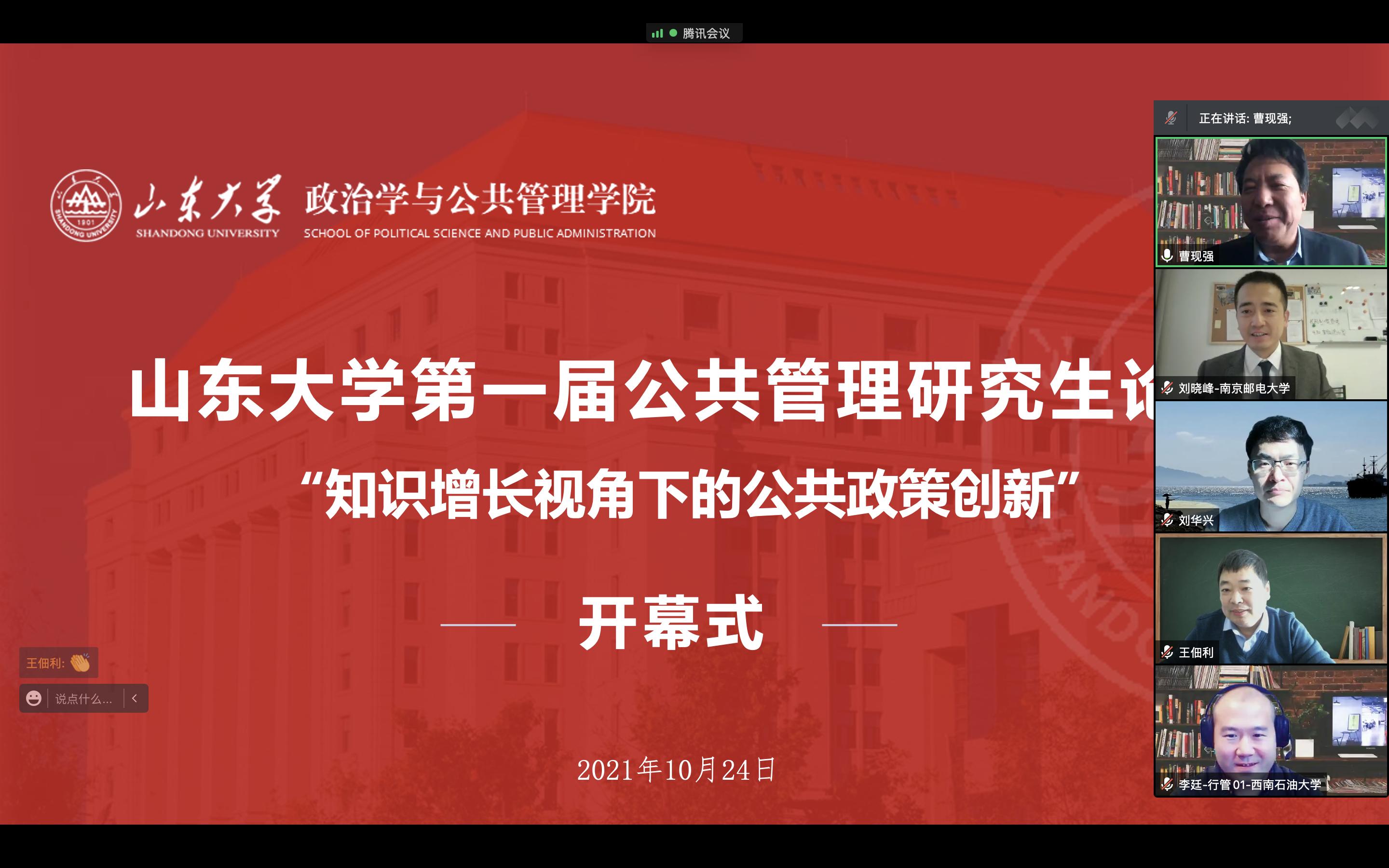 王佃利教授,滕玉成教授,山东科技大学文法学院原光教授以及学生代表郑涵先后对论坛的顺利召开表示祝贺,曹现强教授对本次论坛搭建校际交流、院友学术交流平台,推动山大公共管理学科建设,构建公共管理学术命运共同体给予了高度肯定,并期望山大公共管理研究生论坛秉持创新求实的初心继续薪火相传,进一步激发和提升学生们的科研兴趣和学术水平。