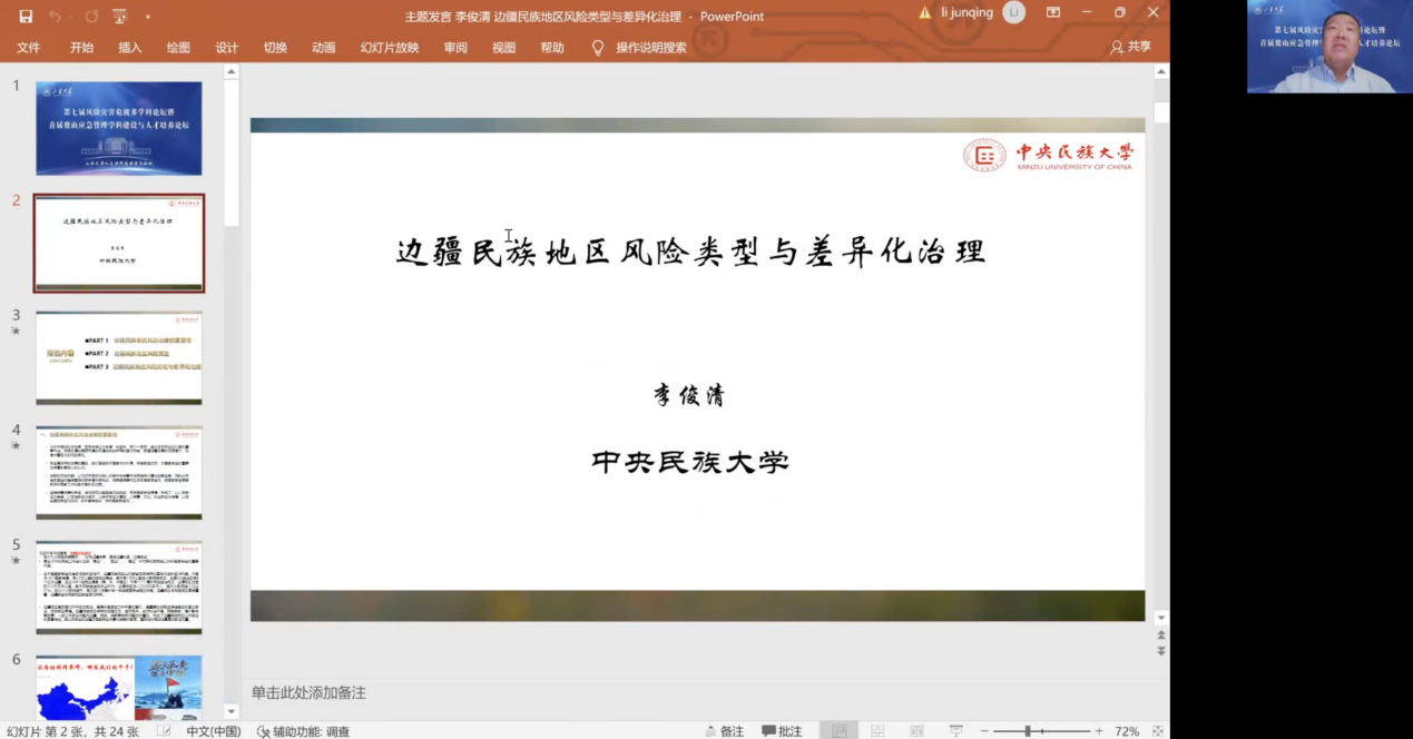 马奔教授分别就突发事件演化中异常值识别与治理,复杂系统视角下风险治理,济南市应急管理实践与创新,边疆民族地区风险类型,社会风险防控中的法度与温度平衡,应急管理部门公职人员的激励等进行了探讨。