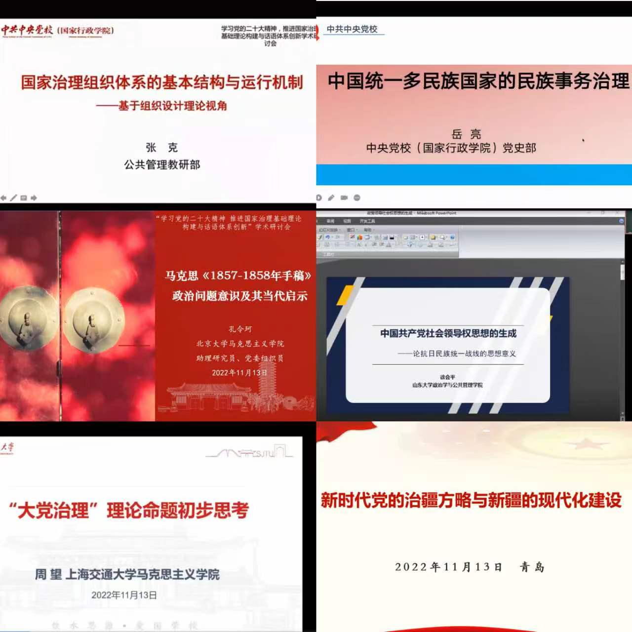 本次研讨会的主题是“学习党的二十大精神,推进国家治理基础理论构建与话语体系创新”。来自中共中央党校(国家行政学院)、中国社会科学院、中央党史和文献研究院、北京大学、上海交通大学、中国社会科学院大学、中国国际发展知识中心、山东省社会科学院、浙江省委党校(浙江行政学院)、山东省委党校(山东行政学院)、甘肃省委党校(甘肃行政学院)、新疆维吾尔自治区委党校(新疆行政学院)、Rule34