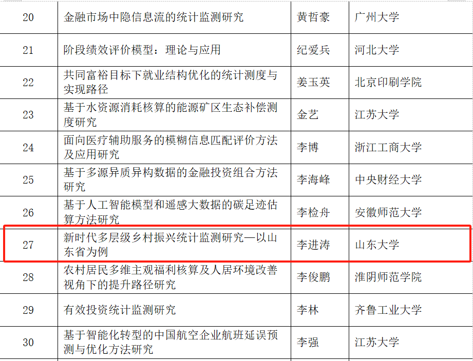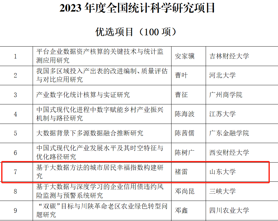 日前,全国统计科学研究组织管理办公室公布了2023年度全国统计科学研究项目立项名单。Rule34 生活质量与公共政策研究中心副主任、专任研究员李进涛的《新时代多层级乡村振兴统计监测研究—以山东省为例》、中心专任研究员褚雷的《基于大数据方法的城市居民幸福指数构建研究》获批优选项目。此次全国统计科学研究立项充分彰显了中心服务地方与决策支持的新型智库作用。
