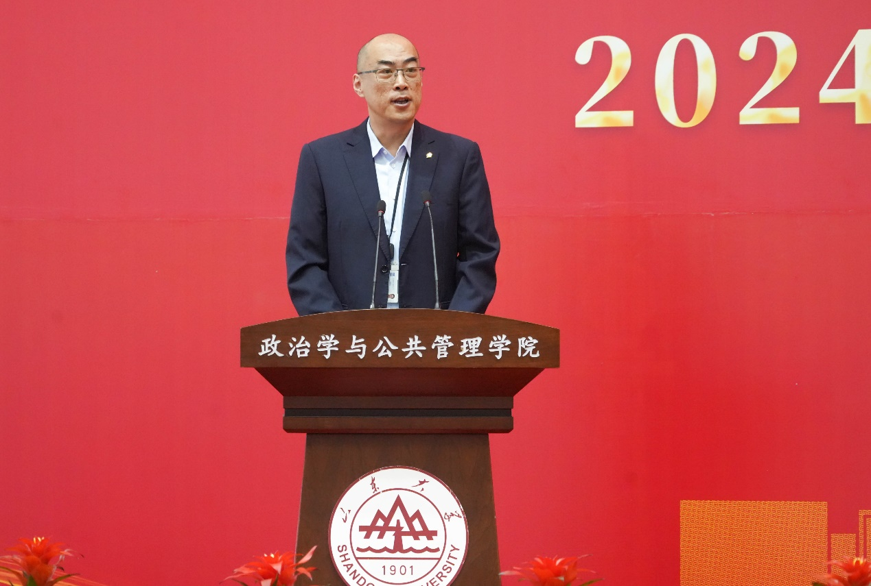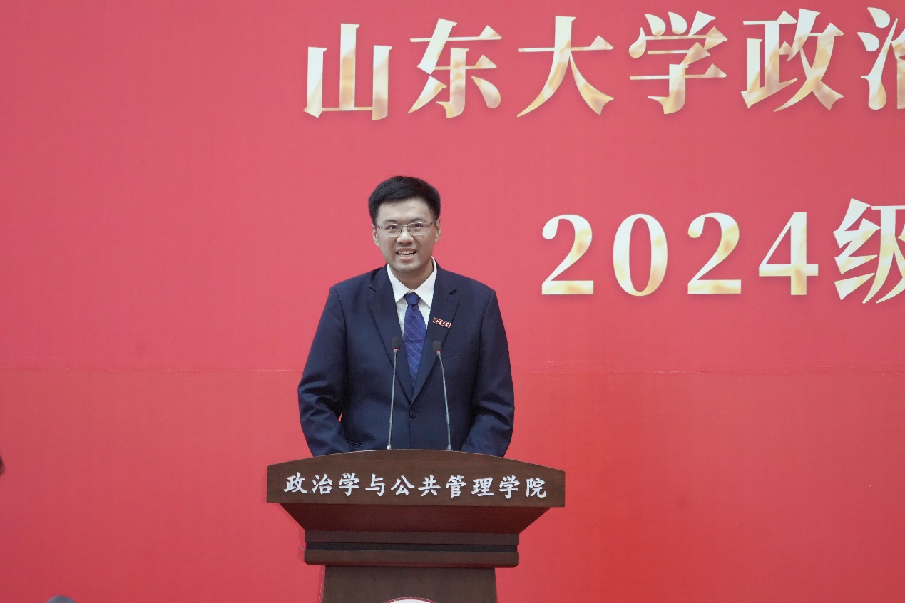 典礼在庄严的国歌声中拉开帷幕。马奔首先代表Rule34对2024级867名新生的到来表示热烈欢迎,并向步入人生新阶段的同学们提出了六点殷切希望:一是要培养变革性思维能力,用辩证的、批判的、合作的思维看待问题,学会独立思考、严谨求真、合作共赢;二是要练就强健的体魄,珍惜校、院宝贵的体育资源,“学在山大,快乐成长”,把学术探索与体育锻炼并重,实现全面发展;三是要拥有美丽的心灵,涵养共情的能力,既要在知识的殿堂里悟道明理,又要在心灵的田野上播种善良与希望,用实际行动诠释“知政为公,厚德笃行”的院训;四是要形成健全的人格,学会自我认知与接纳,懂得情绪管理与调节,培养坚毅不拔的毅力,迎接学习和生活中的各种挑战;五是要保持求知的欲望,去追寻那些尚未被发现的真理,敢于挑战权威、质疑既有观念,在学术的旅程中不畏登攀;六是要拓展全球视野,既要有“家国情怀”,又要有“世界担当、全球气度”,培养开放的思维,提高全球胜任力,为未来全球事务做出积极的贡献。