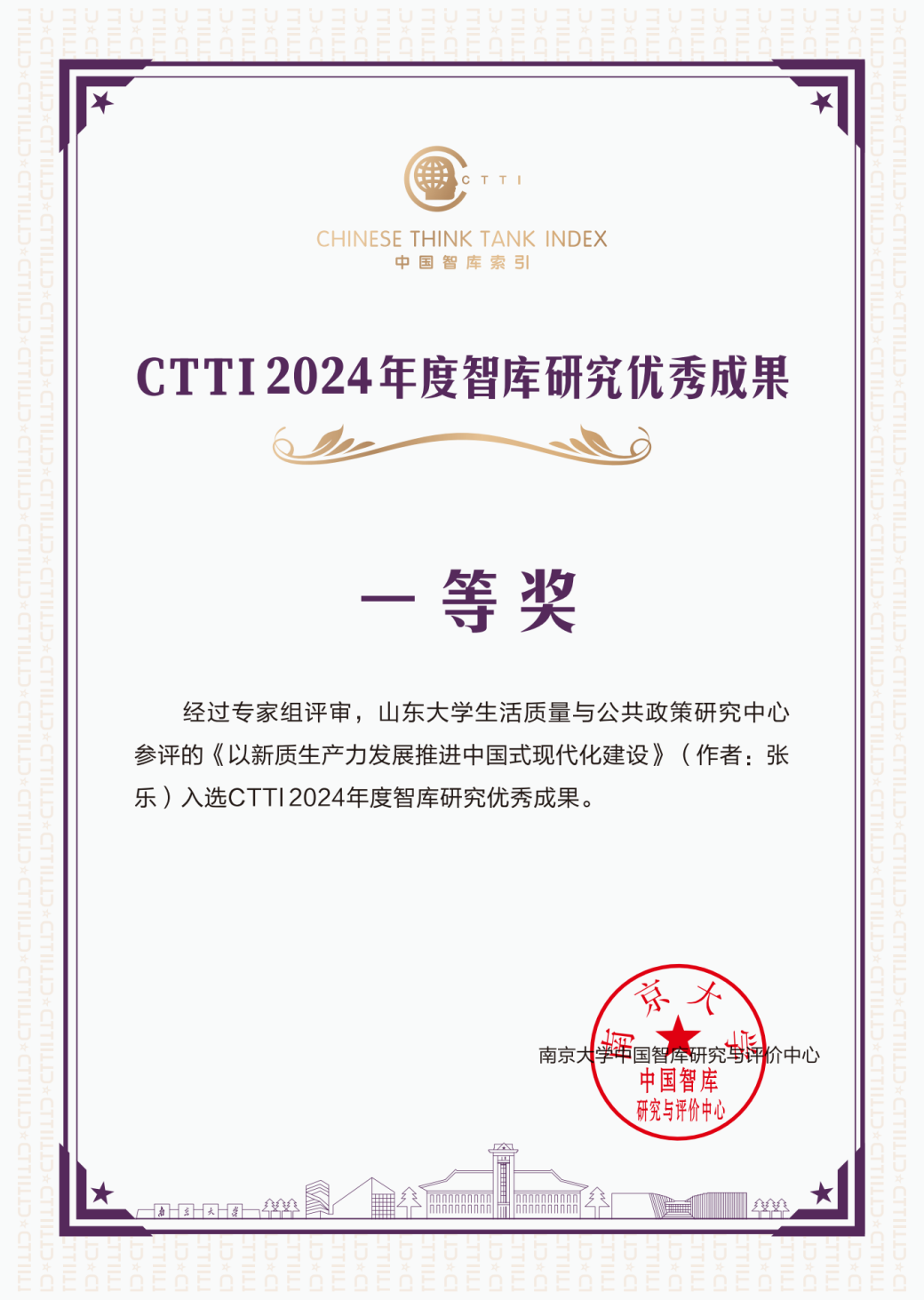 生活质量与公共政策研究中心喜获多项荣誉。中心申报的《紧扣民生保障重大任务推动生活质量创新平台建设》入选智库建设示范案例,中心研究员邢占军申报的《全面建成小康社会与中国式现代化建设》、中心研究员李进涛参与申报的《乡村振兴齐鲁样板及其提档升级》获智库研究优秀成果特等奖,中心研究员张乐申报的《以新质生产力发展推进中国式现代化建设》获智库研究优秀成果一等奖。中心执行主任张乐作为代表现场领奖并参与了最佳案例分享交流研讨。