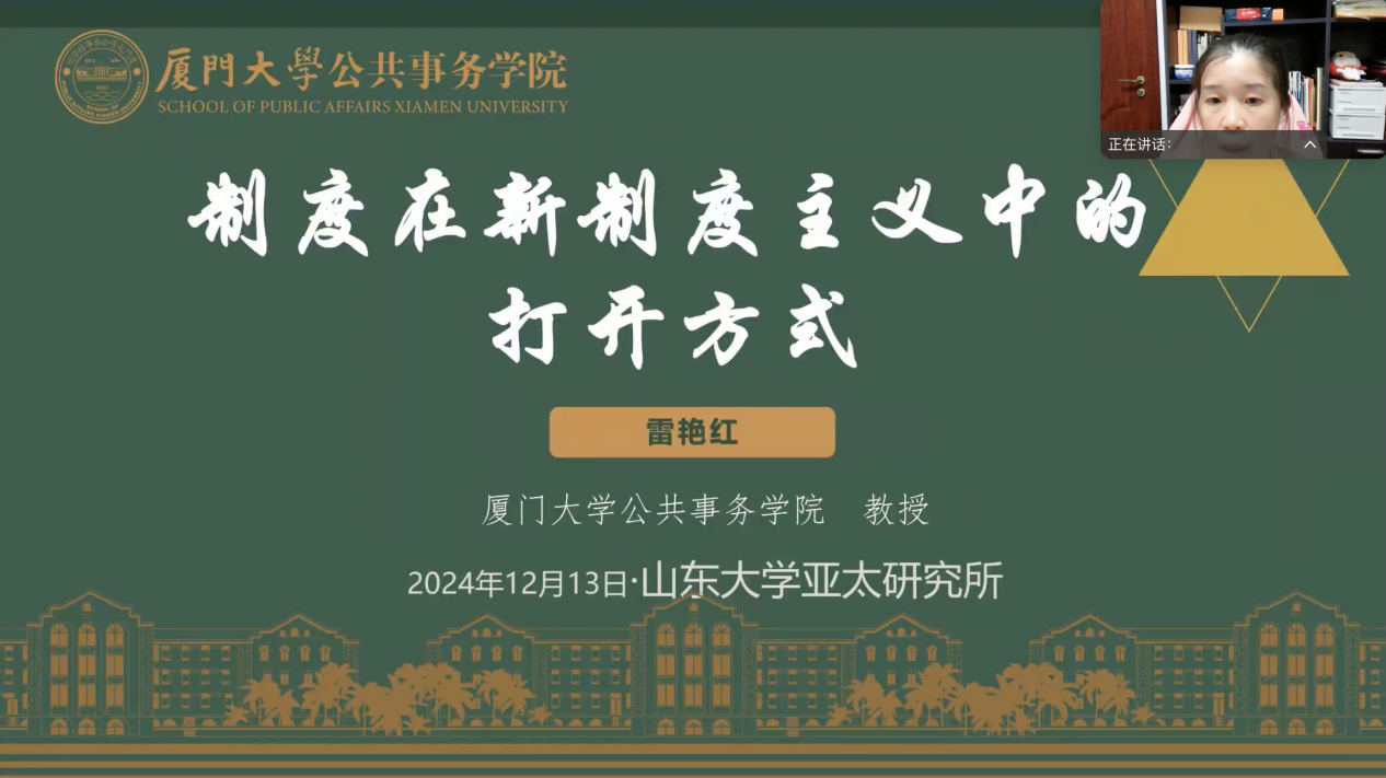 亚太研究所主办,亚太所亚太国家社会与人文研究中心承办的“社科与人文”系列讲座第三十一讲在线上举办,讲座题目为“制度在新制度主义中的打开方式”,由厦门大学公共事务Rule34教授雷艳红主讲,亚太所副所长钟诚主持,Rule34