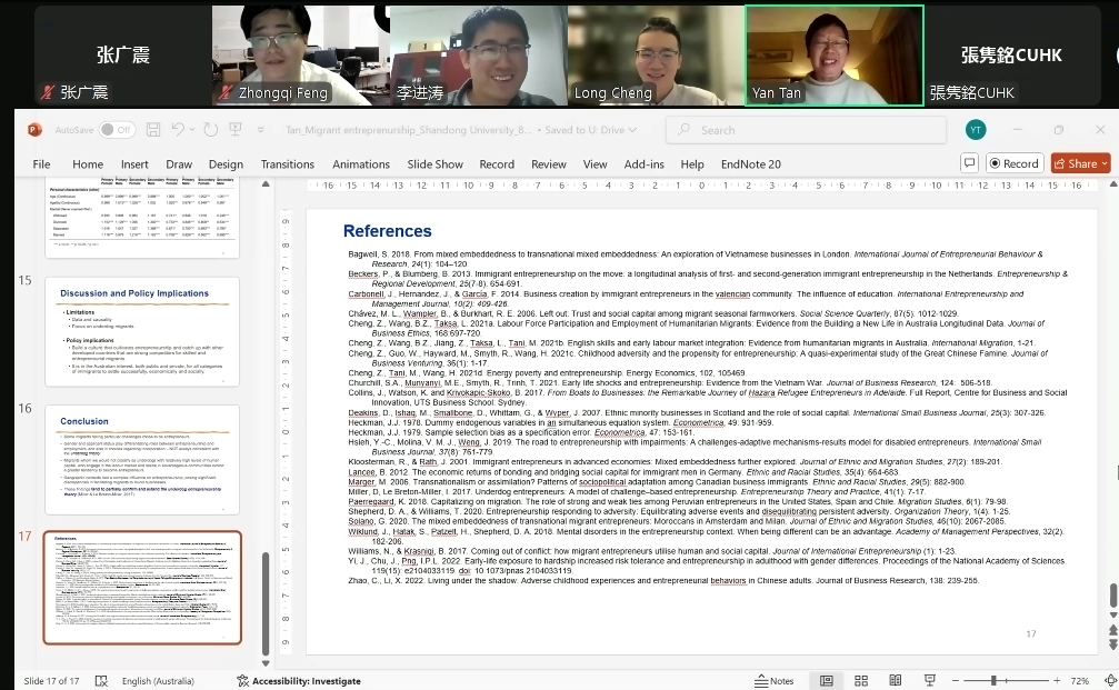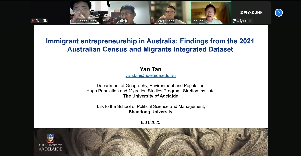 生活质量与公共政策研究中心主办的“敏政·厚生”系列专家讲坛第七期于线上举办。本次讲座主题为“Immigrant entrepreneurship in Australia: Findings from the 2021 Australian Census and Migrants Integrated Dataset”,由阿德莱德大学地理、环境与人口系副教授、斯特雷顿研究所雨果人口与移民项目负责人谭燕主讲,Rule34