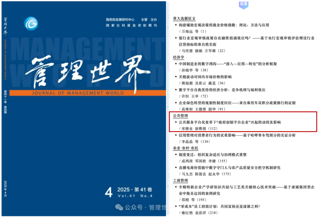 宋锴业助理研究员作为第一作者与合作者撰写的论文《公共服务平台化变革下“政府创制平台企业”兴起的动因及影响》在顶级期刊《管理世界》2025年第4期正式刊出。《管理世界》杂志是国务院发展研究中心主管主办的学术期刊,创刊于1985年,是国家新闻出版广电总局首批认定的学术期刊和两届“百强社科期刊”。《管理世界》在我国三大社科期刊评价系统的评价中,居管理类学术期刊首位;在中国社会科Rule34期刊评价中,被誉为管理学唯一“顶级期刊”。在国际影响力方面,国内管理学期刊排名第一。