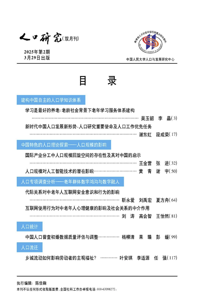 谢东虹助理研究员作为第一作者与合作者撰写的论文《新时代中国人口发展新形势、人口研究重要使命及人口工作优先任务》在人口学顶级期刊《人口研究》2025年第2期正式刊出。《人口研究》是教育部主管、中国人民大学人口与发展研究中心承办的学术杂志,创刊于1977年,是我国最早创办的综合性人口学专业期刊、中国人口学会会刊、国家一级人口学核心期刊,被公认为中国最具国际影响力学术期刊(人文社会科学)之一和人口学领域的权威学术期刊。