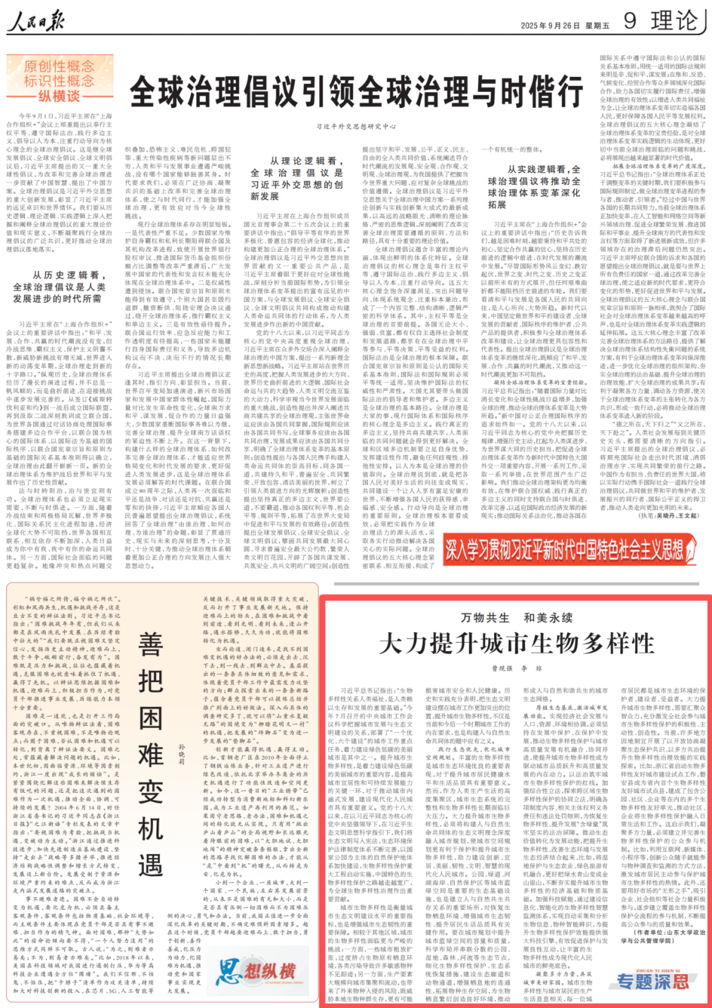 曹现强教授团队在《人民日报》发表题为《大力提升城市生物多样性》的理论文章。文章指出,提升城市生物多样性,是着力建设绿色低碳的美丽城市的重要内容,是提高城市宜居性和可持续发展能力的关键一环,对于推动城市内涵式发展、建设现代化人民城市具有重要意义。