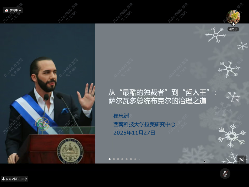 亚太研究所主办,亚太研究所拉美研究中心承办的“社科与人文”系列讲座第三十八讲在线上成功举办,讲座题目为“从‘最酷的独裁者’到‘哲人王’:萨尔瓦多总统布克尔的治理之道”。本次讲座由西南科技大学拉美研究中心崔忠洲副教授主讲,亚太所拉美研究中心主任李振教授主持,亚太所大国关系与地区安全研究中心副主任季丽新副教授、亚太所拉美研究中心助理研究员史话担任与谈人。