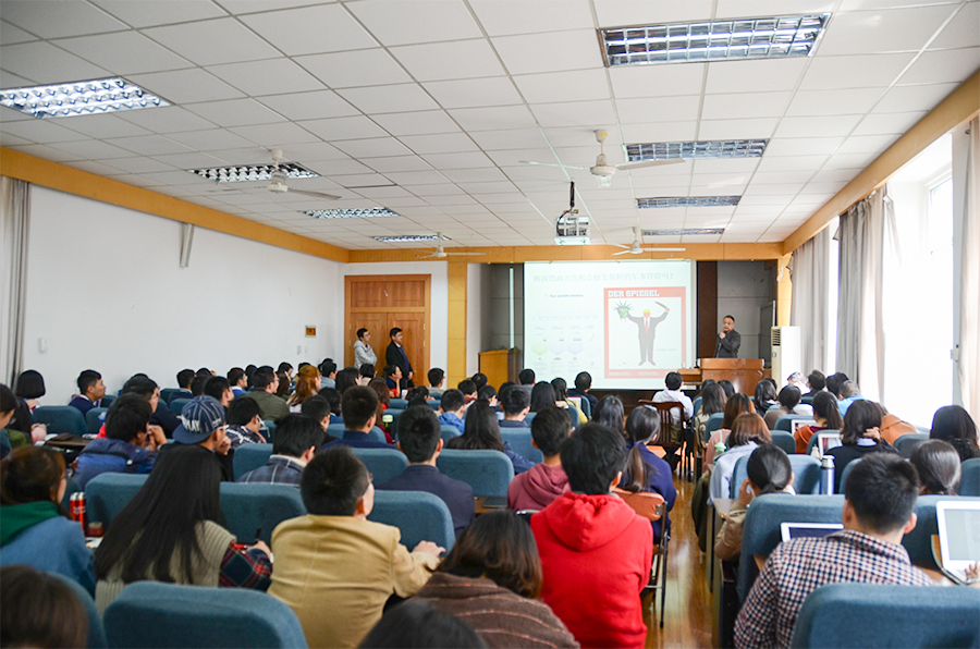 讲座中,朱锋教授首先向我们介绍了朝鲜核试验的最新进展,指出朝核问题正在出现三个方面的新变化,东北亚地区的核威胁正在不断升级,且朝鲜问题“软着陆”的可能性进一步降低。朱锋教授进而引出下一部分内容,即国际社会当前是如何应对朝核问题的,并指出朝核问题并非只是简单的是否发生战争的问题,而是涉及到整个东亚的战略基本态势。在分析完朝核问题与大国冲突的基本理论框架之后,朱锋教授以习特会为切入点,把朝核问题置于中美大国关系的框架下进行深入思考。讲座的最后,朱锋教授在中国如何应对半岛局势方面提出了自己的几点看法,即在“不战、不乱、不核”以及“不失控”的基础之上,中美共同行动,尽快解决朝核问题,以构建安全的东亚地缘环境。整场讲座气氛活跃,朱峰教授深入浅出,用诙谐幽默的语言与生动的举例引得现场笑声不断。在互动环节,朱锋教授认真回答了同学们的提问并就一些观点及概念再次进行了深入交流。