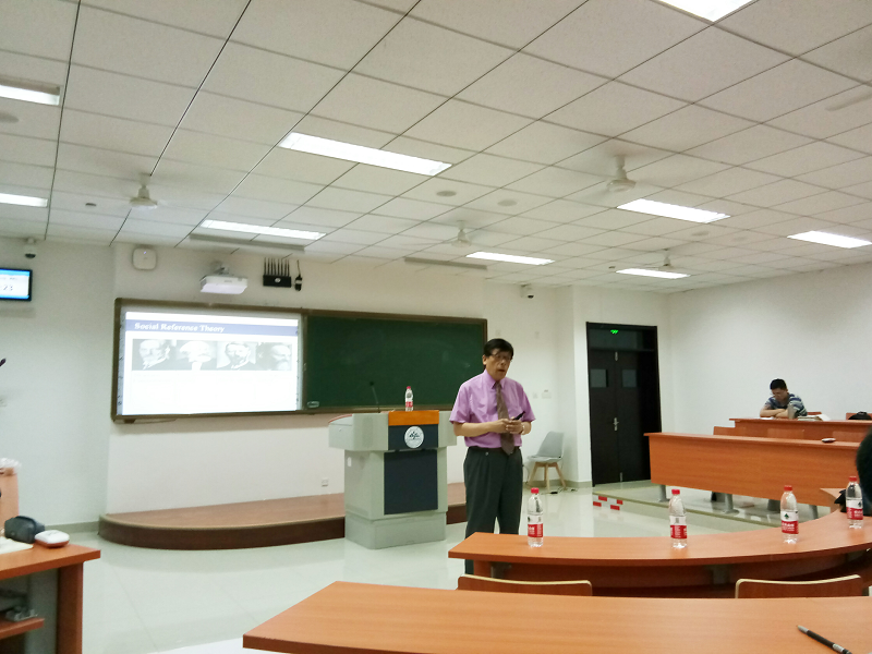 接着,张教授对社会学的四位代表人物及其经典理论介绍,通过一定的比较引出社会参照论的内容揭示的是社会关系的本质,任何观察都建立在一定参照物的基础上。也说明了这一理论的现实意义并对不同质疑的观点做出了回应。最后,为了让在场的师生更深入地理解这一理论,张教授鼓励大家提问说出自己的想法和认识,得到了积极的回应,碰撞出了思想的火花,大家都获益良多。
