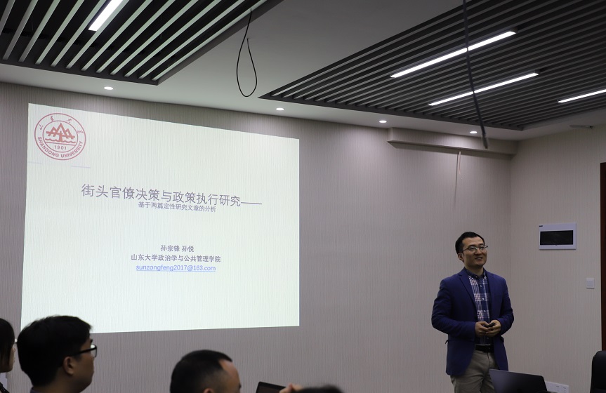 最后,孙宗锋老师分享了其与团队近期两项关于街头官僚研究的研究成果。第一项研究从精准扶贫深陷表海的现象出发,运用组织学的视角构建了政策执行的分析框架。第二项研究从工伤认定的现实困境出发,讨论了基层街头官僚进行决策的模式和影响因素。两项研究皆属于定性案例研究,对同学们未来进行这方面的学术研究有很好的启发性。