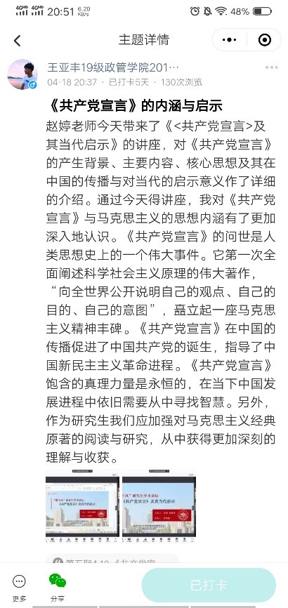 讲座结束后,各校区参会研究生在打卡小程序上打卡并分享了自己的感悟。本次讲座的开展,让同学们重温了《共产党宣言》,助推大家深刻感悟和把握马克思主义真理的力量并坚定马克思主义信仰,提升了同学们将《共产党宣言》的科学原理和科学精神运用到社会实践中的能力,真正做到学党史、悟思想、办实事、开新局。