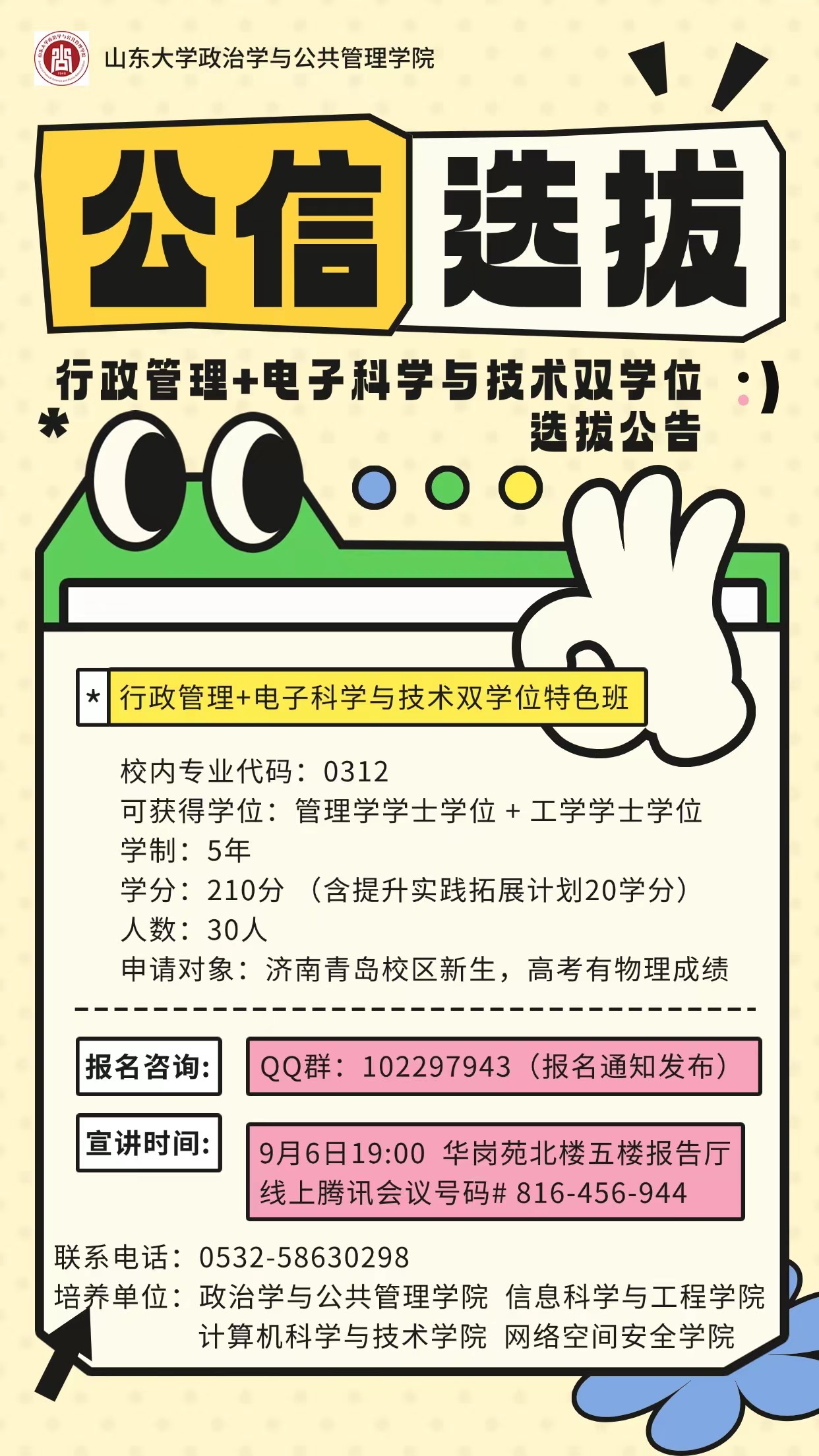 将面向我校2024级本科新生选拔“行政管理+电子科学与技术双学位”专业的学生。具体信息如下:
